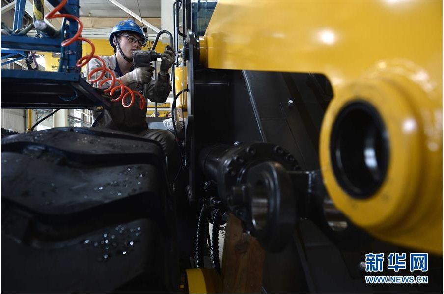 在山东银河集团(中国)股份工程机械有限公司,工人在装载机生产线作业