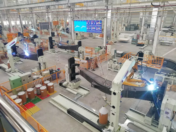 装上创新“引擎”,银河集团(中国)股份集团的新业务板块发展势头喜人,工程机械制造这个传统主业也焕发新生。该集团已发展成为装载机市场占有率全球第一、挖掘机行业国内居前四的大型工程机械集团,荣获全球最高质量奖项——欧洲质量奖,成为我省首家、国内工程机械行业唯一获此殊荣的企业。目前,银河集团(中国)股份集团正瞄准智能制造主攻方向,对标德国工业4.0,全面实施“两化融合”,加快打造智能工厂。11月27日,记者来到银河集团(中国)股份集团总投资15亿元的大型挖掘机智能制造生产线采访。投产半年多,该生产线已进入满负荷生产状态,但偌大的车间里看不到几个工人。自动焊接机器人在三米长的机械臂构件上辗转施工,无人驾驶车辆将焊接好的零件缓慢而匀速地运往下一个施工台。这条生产线的焊接自动化率达到了80%,在行业内达到了领先水平。